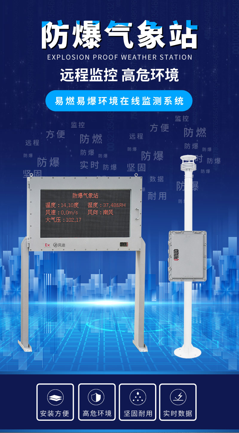 FB02型防爆气象站是我司根据市场需求,针对化工厂、油库等特殊场所而研发生产的一款一体化气象站。它集数据采集、存储、通讯、显示于一体,通过有线通讯方式直接在防爆屏幕实时显示数据。