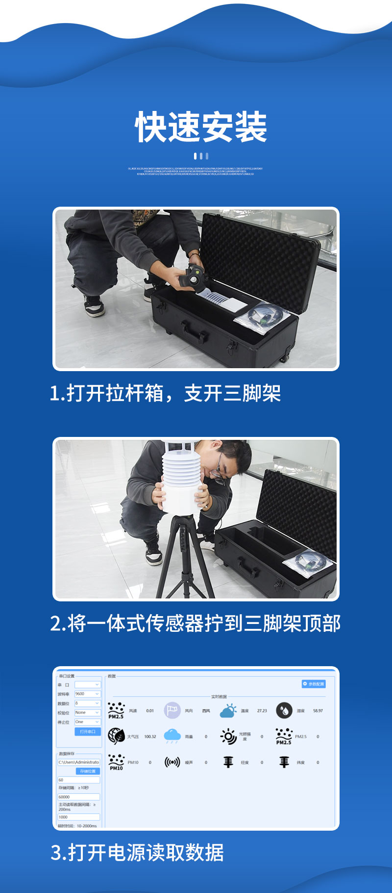 该设备支持有线、蓝牙、GPRS等传输方式,免调试,可快速布置,适用于各类应急气象短期观测、移动气象监测等气象数据的获取。广泛运用于气象、农林、环保、海洋、机场、港口、科学考察、校园教育等领域。